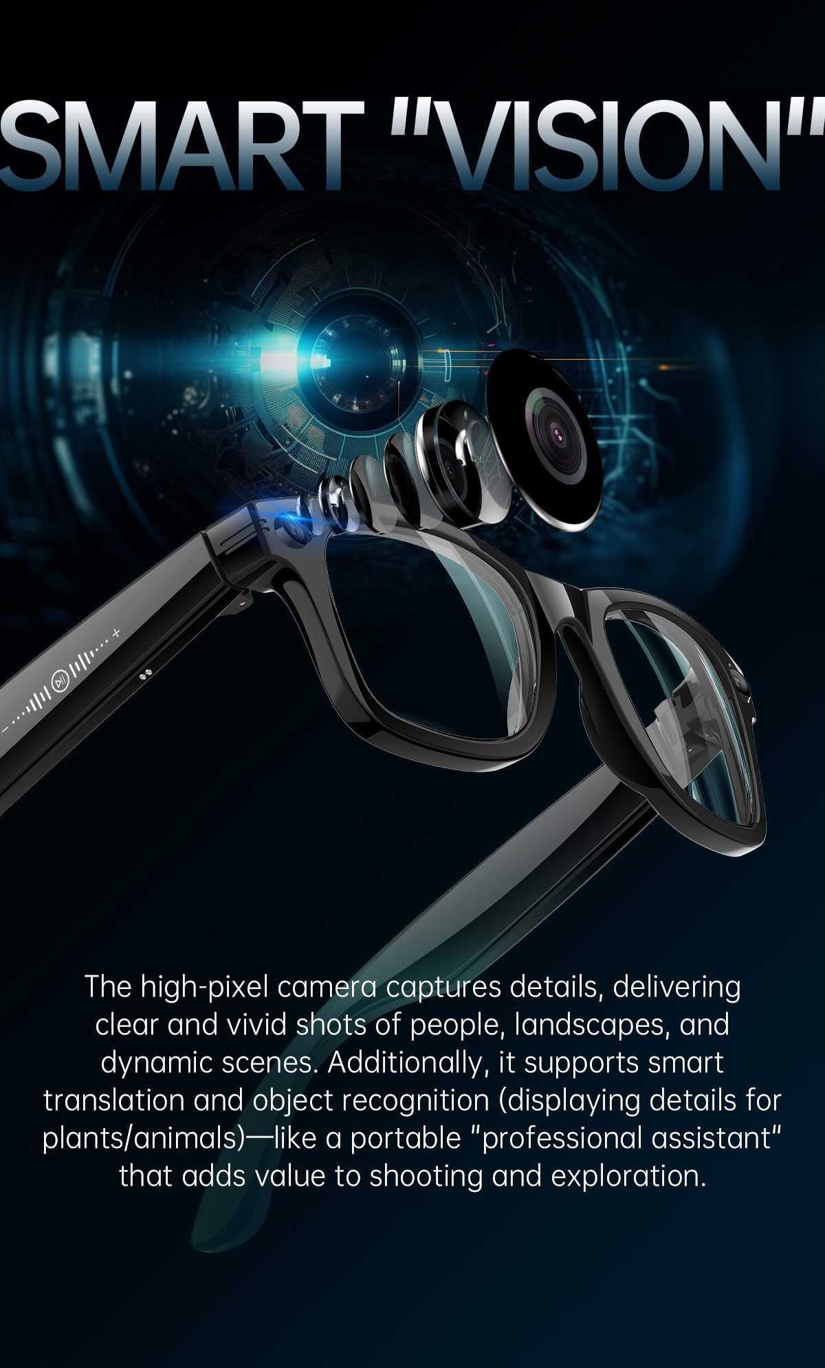 2.【AI Photo Recognition】 Capture the world through the camera. Powerful image recognition technology combined with advanced algorithms accurately analyzes captured content. Recognition results are not only delivered clearly to your ears, but also displayed in detail on the accompanying app. This integrated audio and screen interface allows you to get comprehensive, seamless answers.